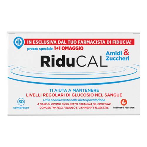 RiducalAmidi & zuccheriDescrizione Integratore alimentare di cromo e vitamina PP con proteine concentrate di fagiolo ed estratto di gymnema sylvestris standardizzato. Il cromo in sinergia con gli estratti di fagiolo e di gymnema favoriscono il metabolismo dei carboidrati. Ingredienti Proteine di fagiolo estratto secco attività alfamilasica, Gymnema sylvestris estratto secco, Vitamina PP, Cromo. Caratteristiche nutrizionali per dose (2 compresse) %RDA* Proteine di fagiolo estratto secco attività alfamilasica 1000 mg 8000 U - Gymnema sylvestris estratto secco 200 mg - Vitamina PP 27 mg 169 Cromo 200 µg 500 *%RDA= Razione Gi...