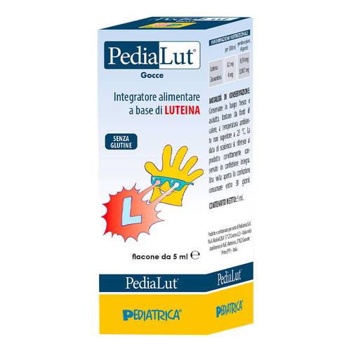 PediaLut gocce Descrizione Integratore alimentare a base di luteina, utile in caso di diminuito apporto o aumentato fabbisogno di tale nutriente. Ingredienti Contenuto del tappo dosatore: luteina e zeaxantina da Tagetes erecta L. fiori (luteina, zeaxantina, sciroppo di glucosio, amido modificato, amido di mais; antiossidanti: sodio ascorbato, DL-alfa-tocoferolo); agente antiagglomerante: silicio biossido. Contenuto del flacone: acqua; correttore di acidità: sodio lattato sol. 60%; conservante: potassio sorbato; correttore di acidità: acido citrico. Senza glutine. Modalità d'uso Si consiglia di assumere per via orale 4...
